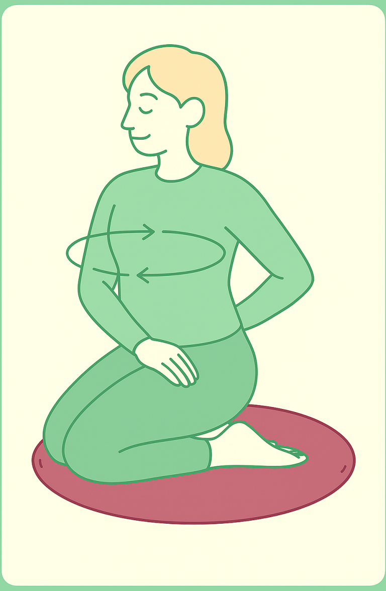 Dann fangen Sie an mit sanftem Kreisen in der Zwerchfellregion. Fünf mal links herum, fünf mal rechtsherum. Später können Sie die Kreisen intensivieren.